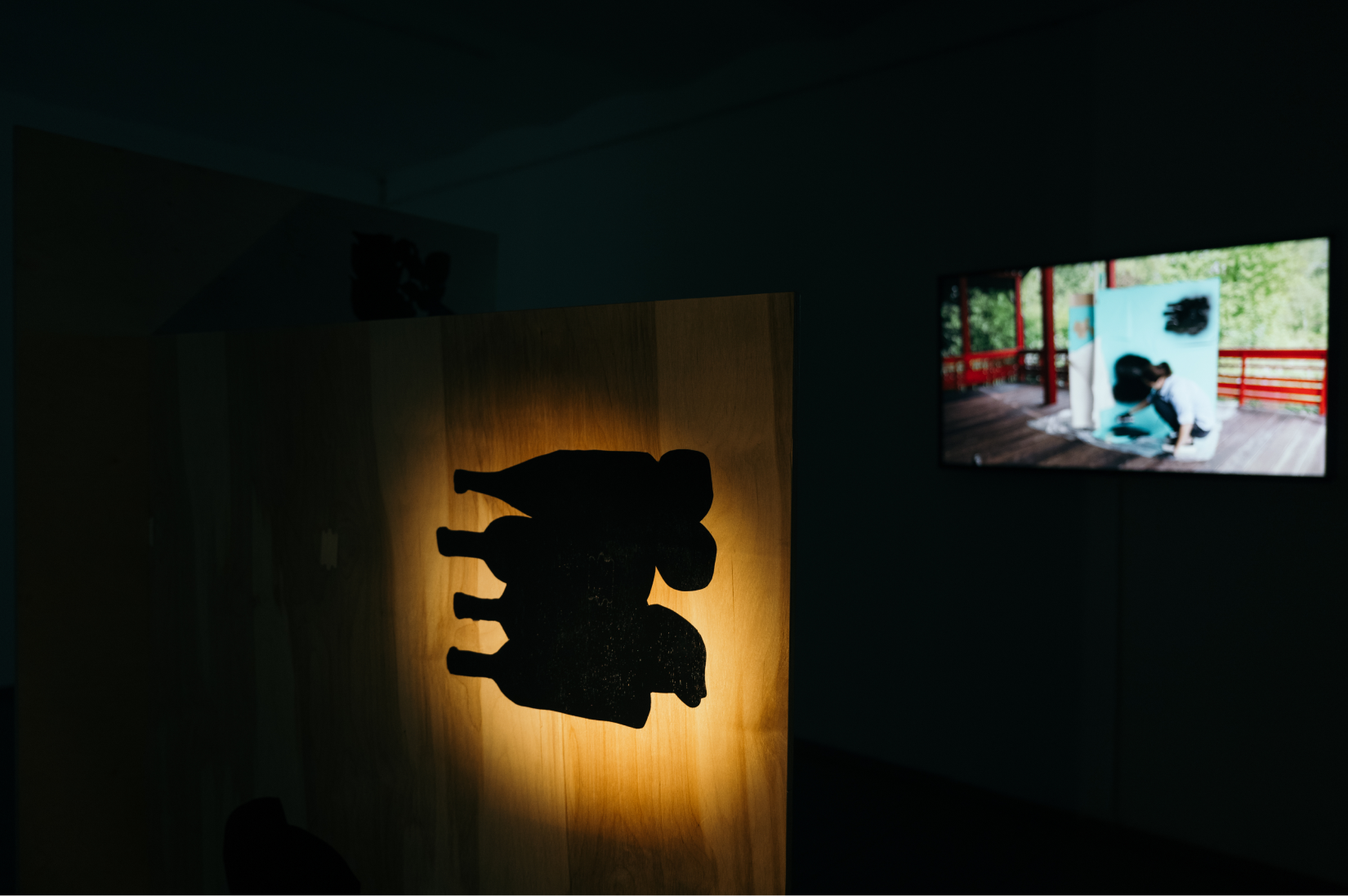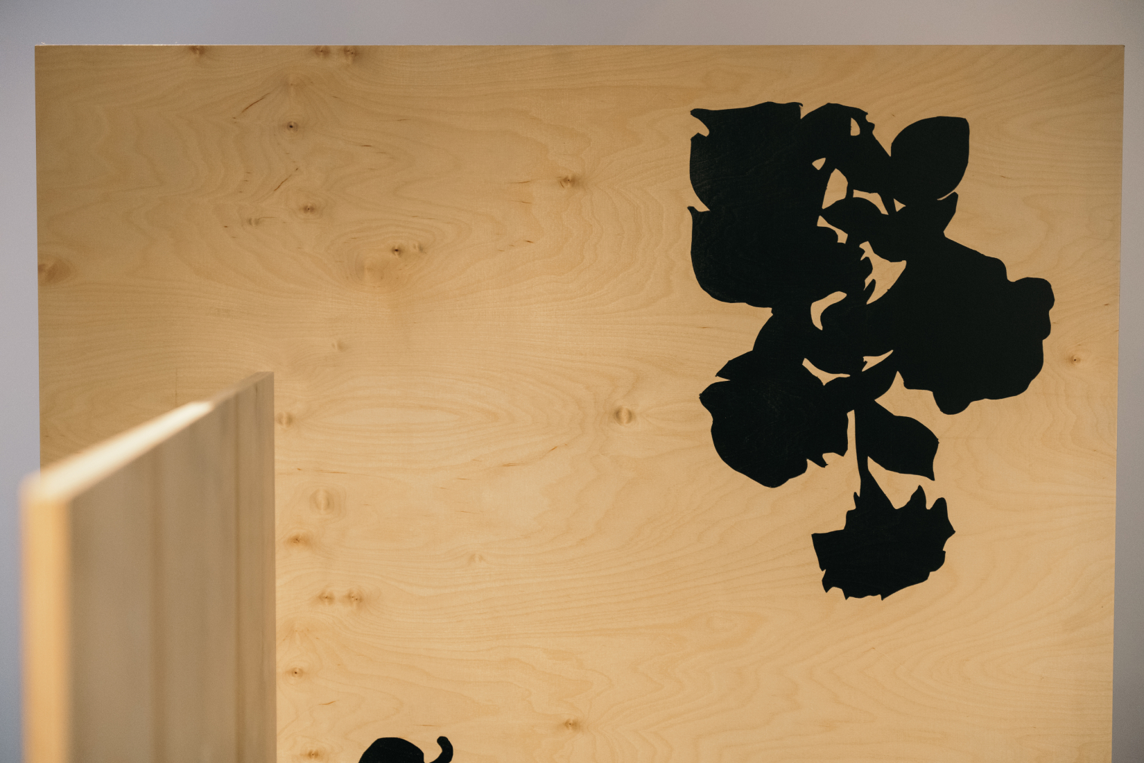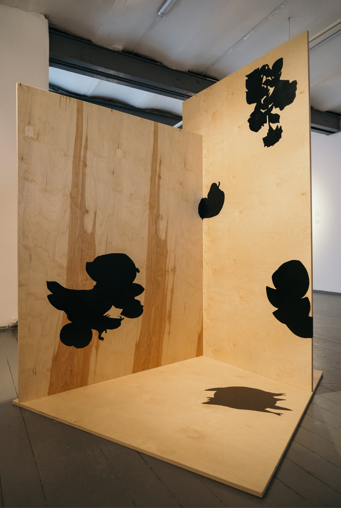 Эти трафареты сделаны на основе натюрмортов отца, у которого, в отличие от меня, есть академическое художественное образование. Я перенесла изображения на конструкцию, представляющую фрагмент условного пространства. «Стационарность» конструкции сделала нанесенные изображения менее уязвимыми и более устойчивыми к последствиям оценочных суждений.